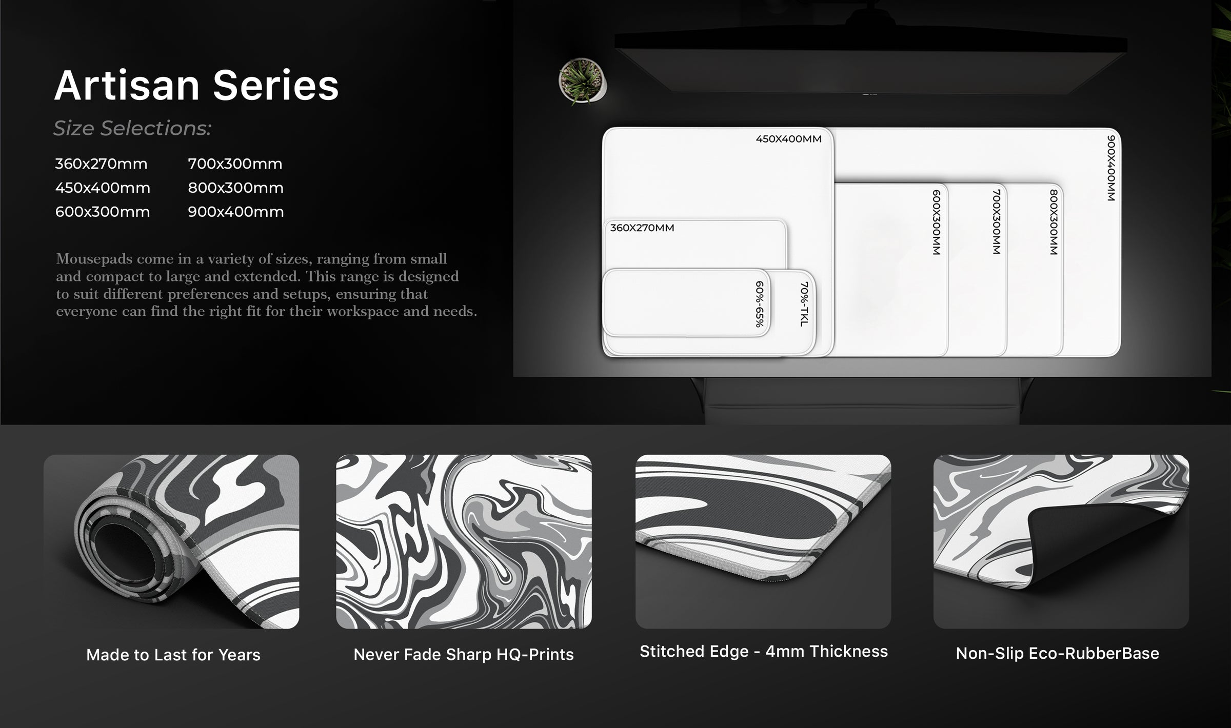 • Our deskmats come in different sizes. 900×400, 800×300, 700×300, 600×300, 450x400, 360x270mm sizes