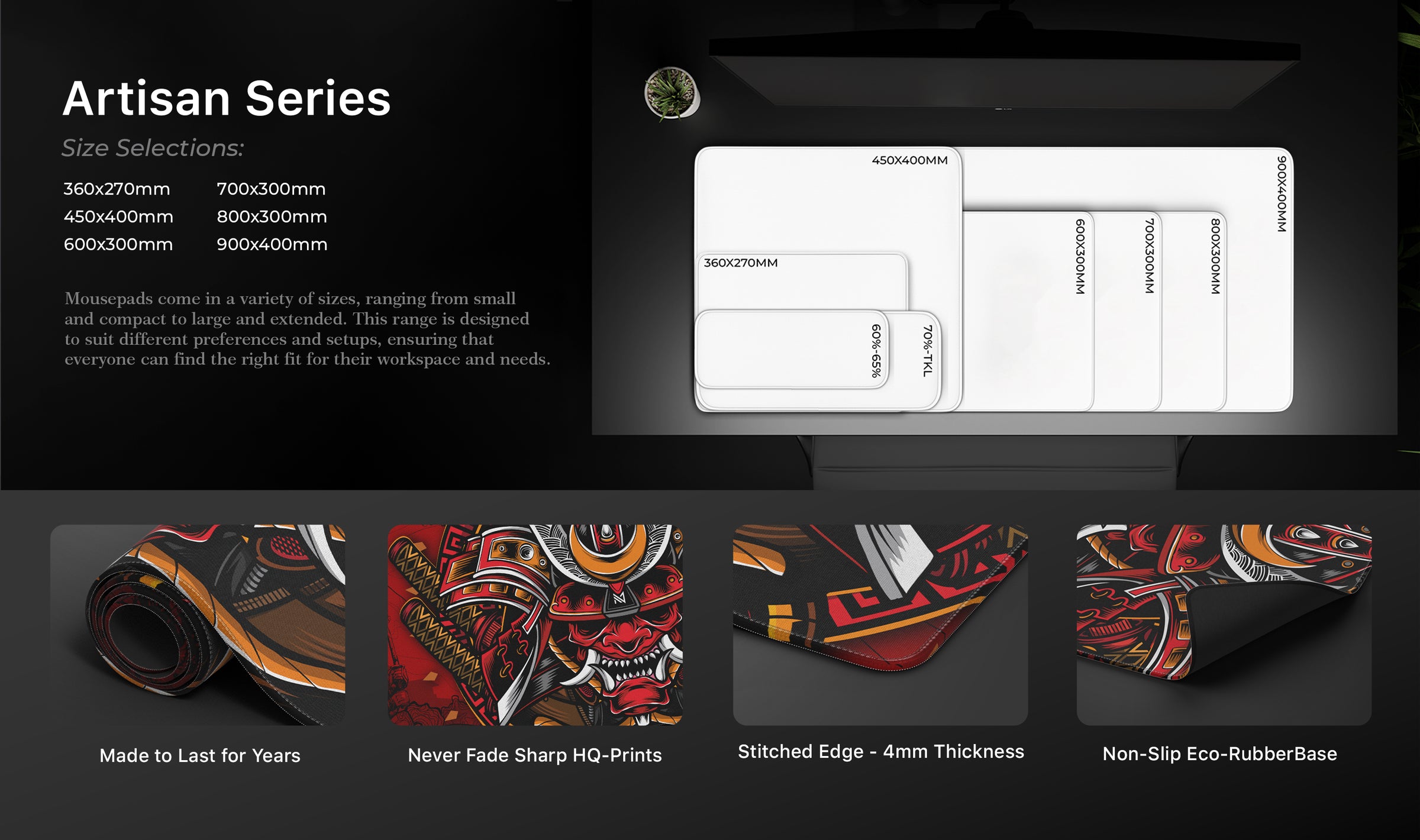 • Our deskmats come in different sizes. 900×400, 800×300, 700×300, 600×300, 450x400, 360x270mm sizes