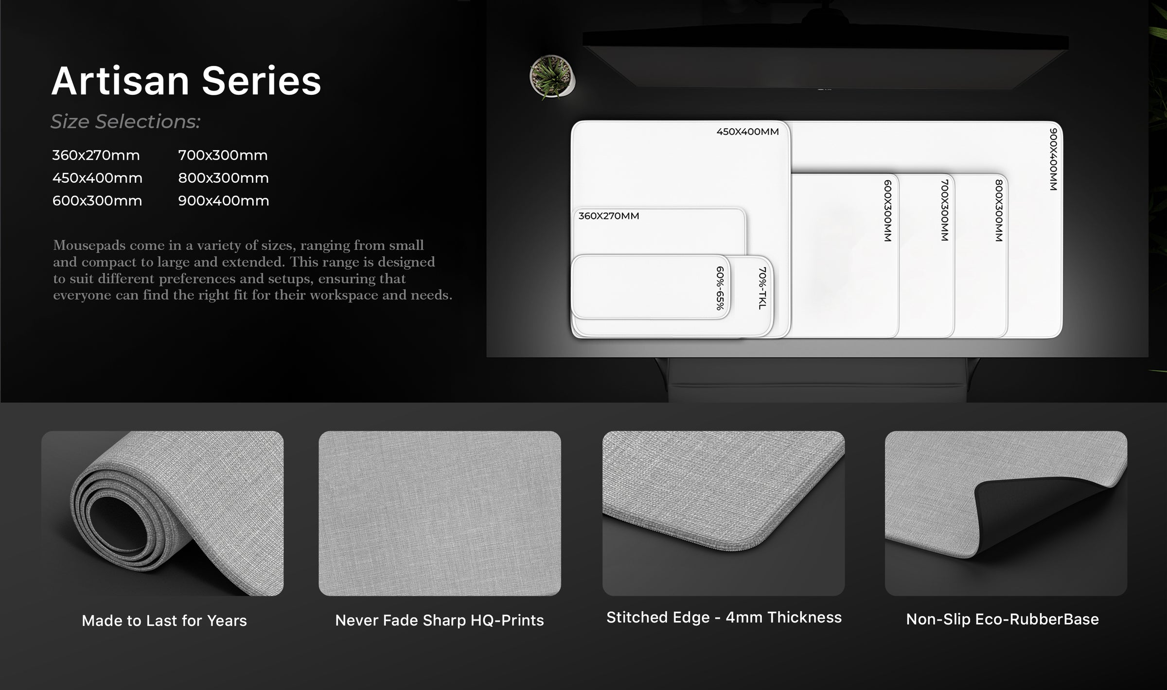 • Our deskmats come in different sizes. 900×400, 800×300, 700×300, 600×300, 450x400, 360x270mm sizes