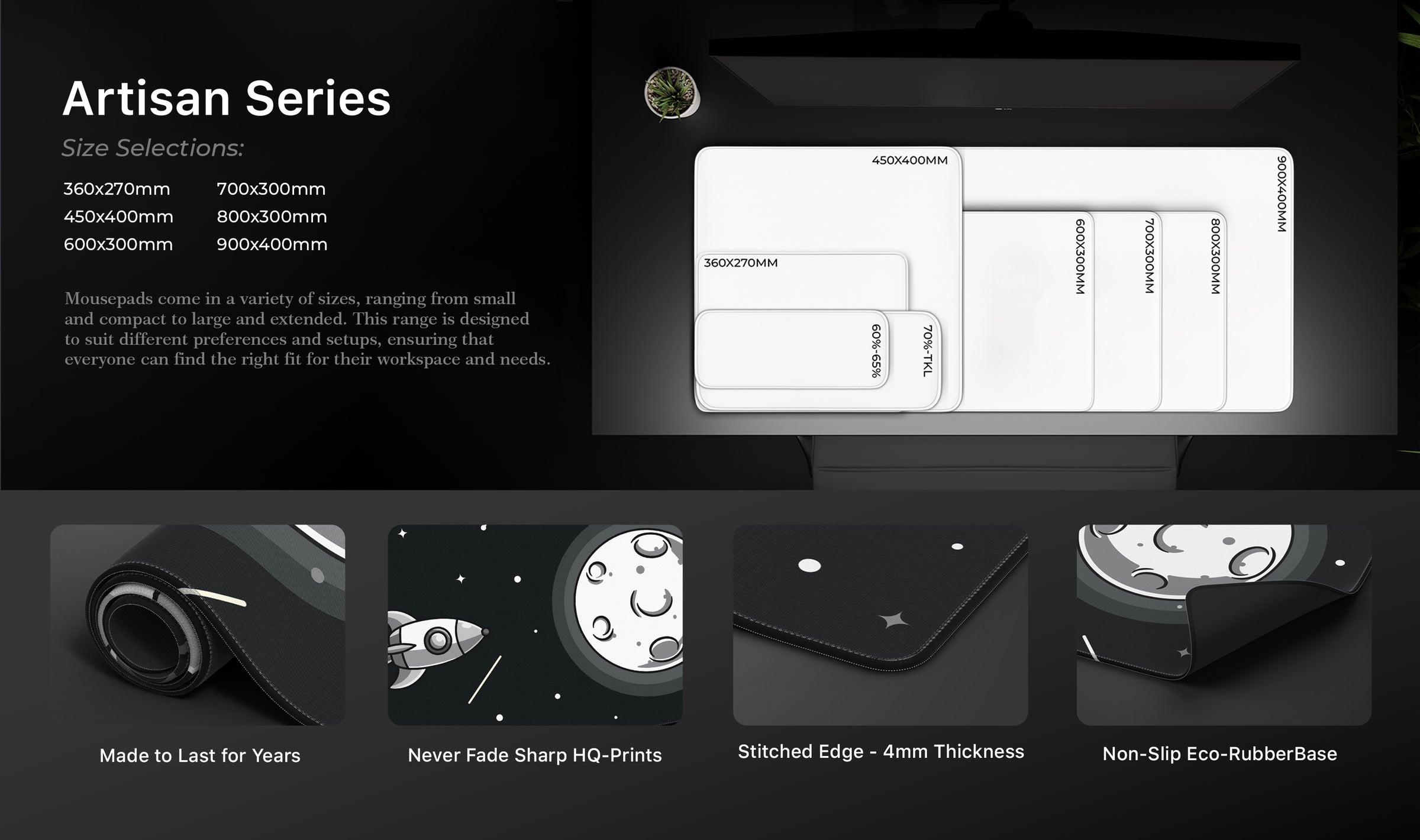 • Our deskmats come in different sizes. 900×400, 800×300, 700×300, 600×300, 450x400, 360x270mm sizes
