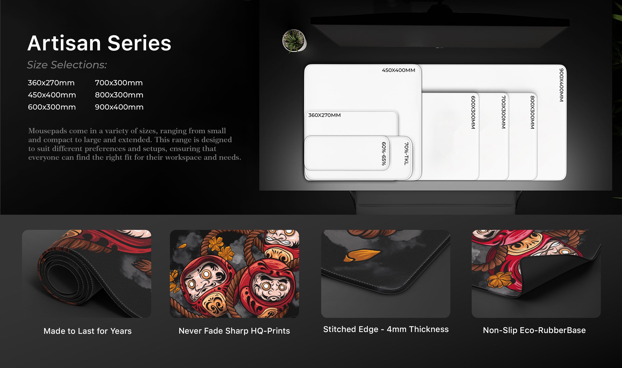 • Our deskmats come in different sizes. 900×400, 800×300, 700×300, 600×300, 450x400, 360x270mm sizes