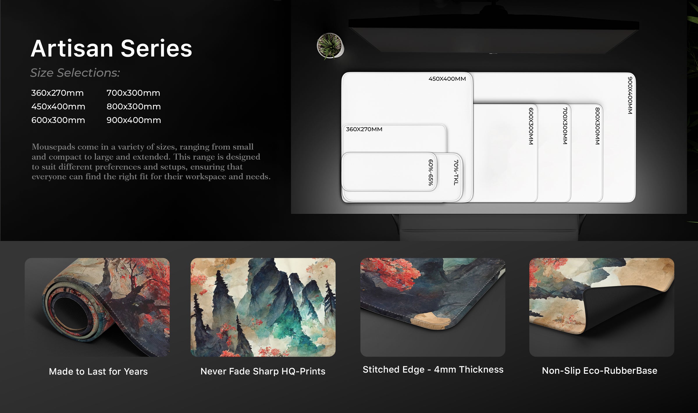 • Our deskmats come in different sizes. 900×400, 800×300, 700×300, 600×300, 450x400, 360x270mm sizes