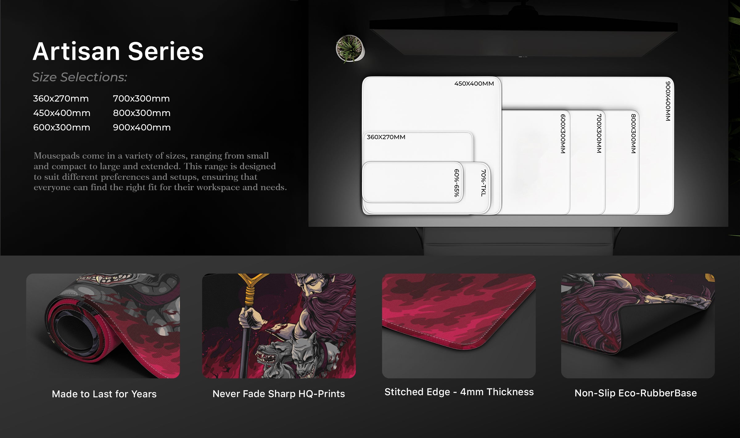 • Our deskmats come in different sizes. 900×400, 800×300, 700×300, 600×300, 450x400, 360x270mm sizes