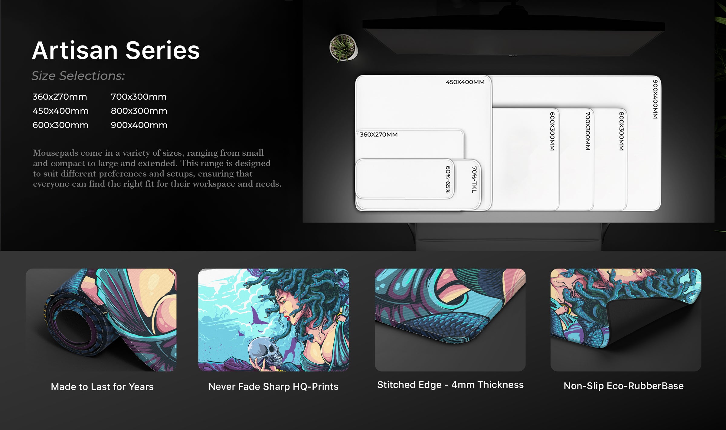 • Our deskmats come in different sizes. 900×400, 800×300, 700×300, 600×300, 450x400, 360x270mm sizes