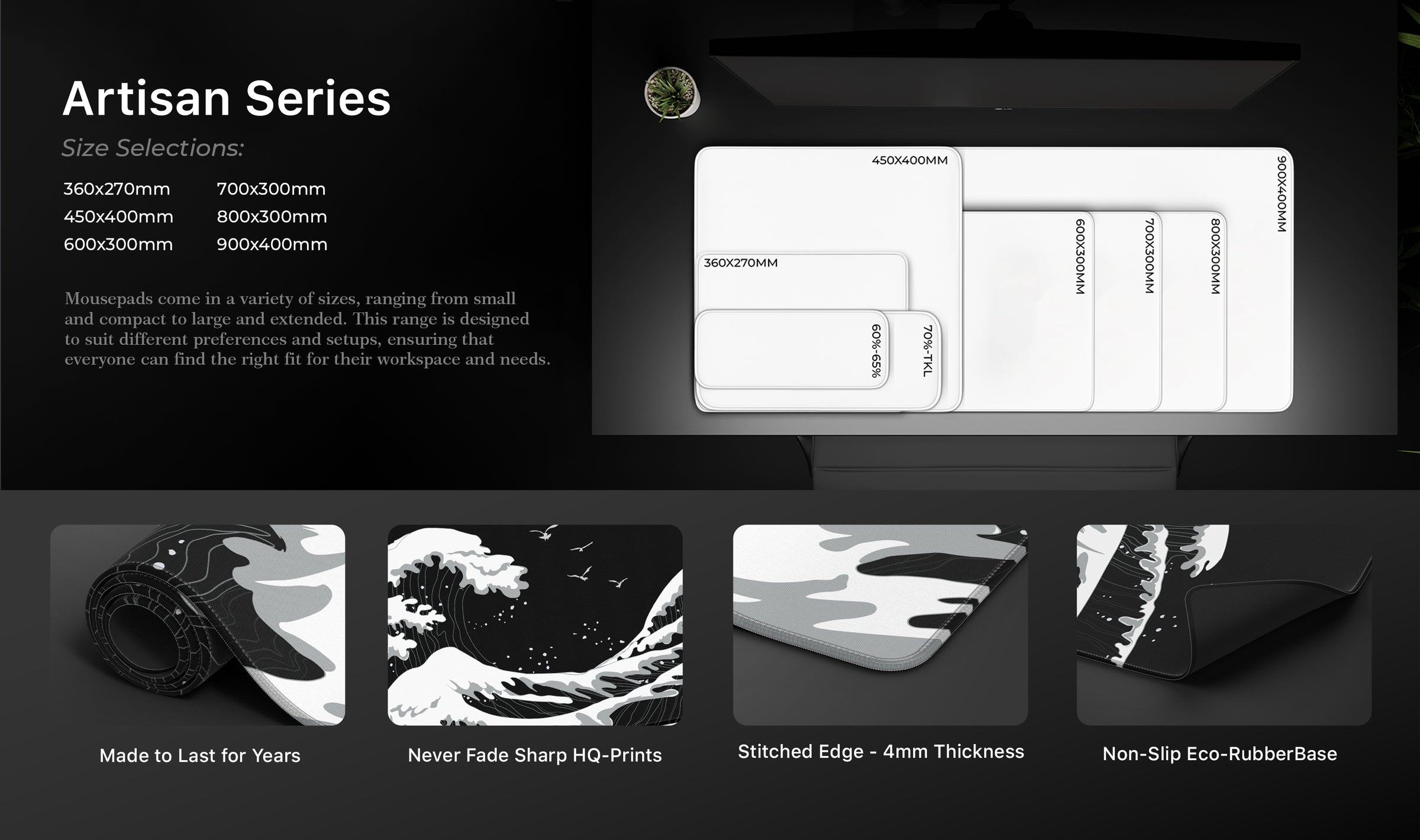 • Our deskmats come in different sizes. 900×400, 800×300, 700×300, 600×300, 450x400, 360x270mm sizes