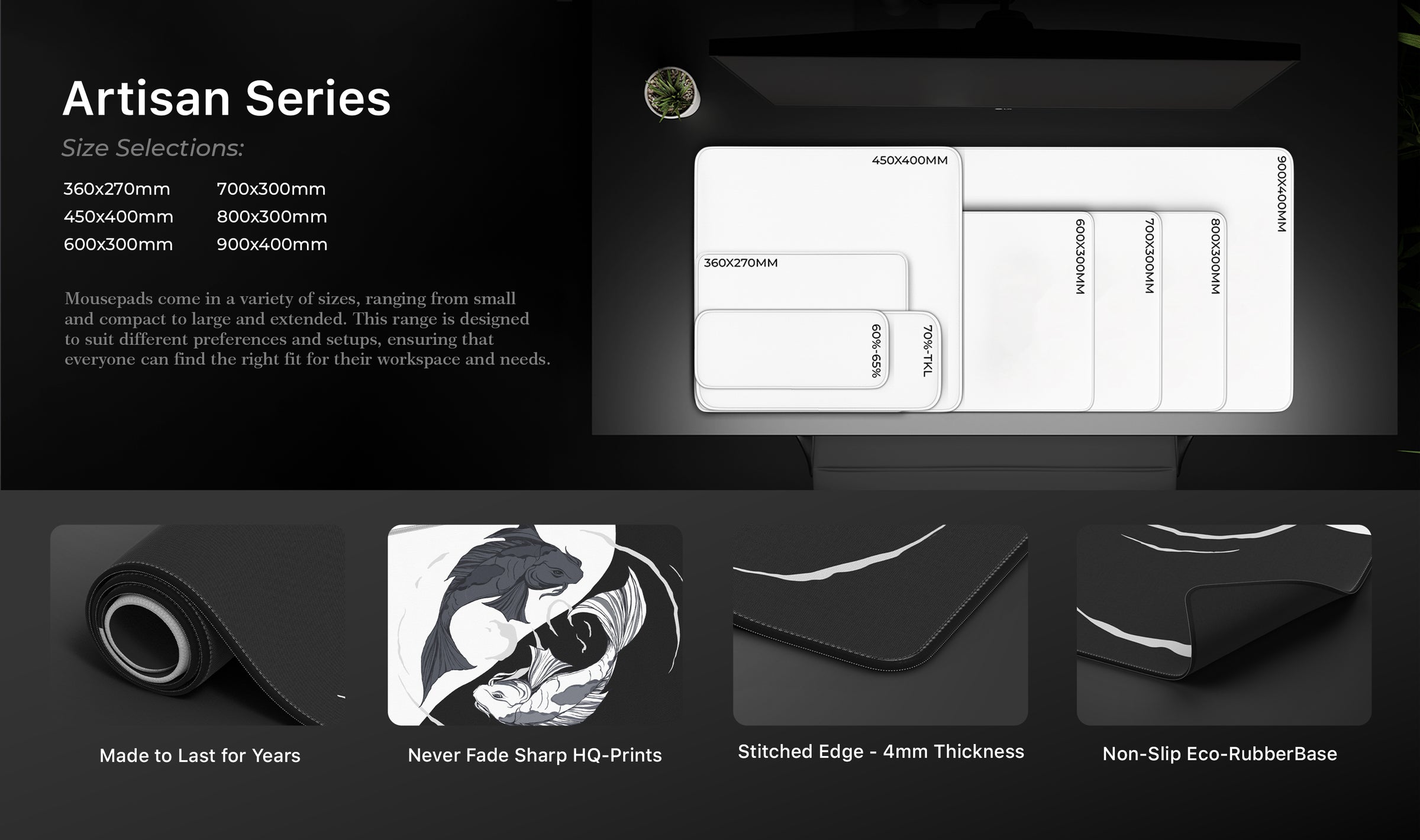 • Our deskmats come in different sizes. 900×400, 800×300, 700×300, 600×300, 450x400, 360x270mm sizes