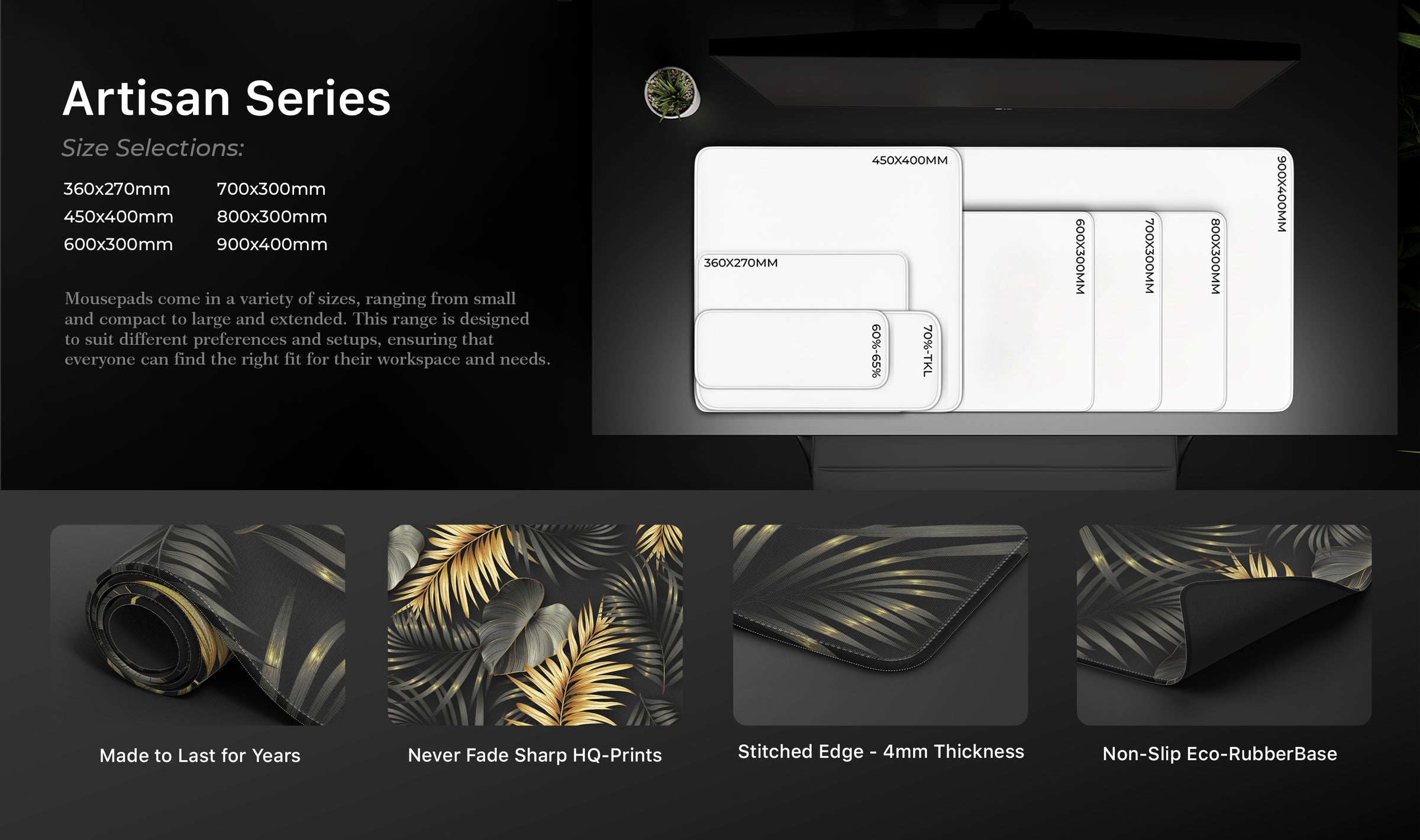 • Our deskmats come in different sizes. 900×400, 800×300, 700×300, 600×300, 450x400, 360x270mm sizes