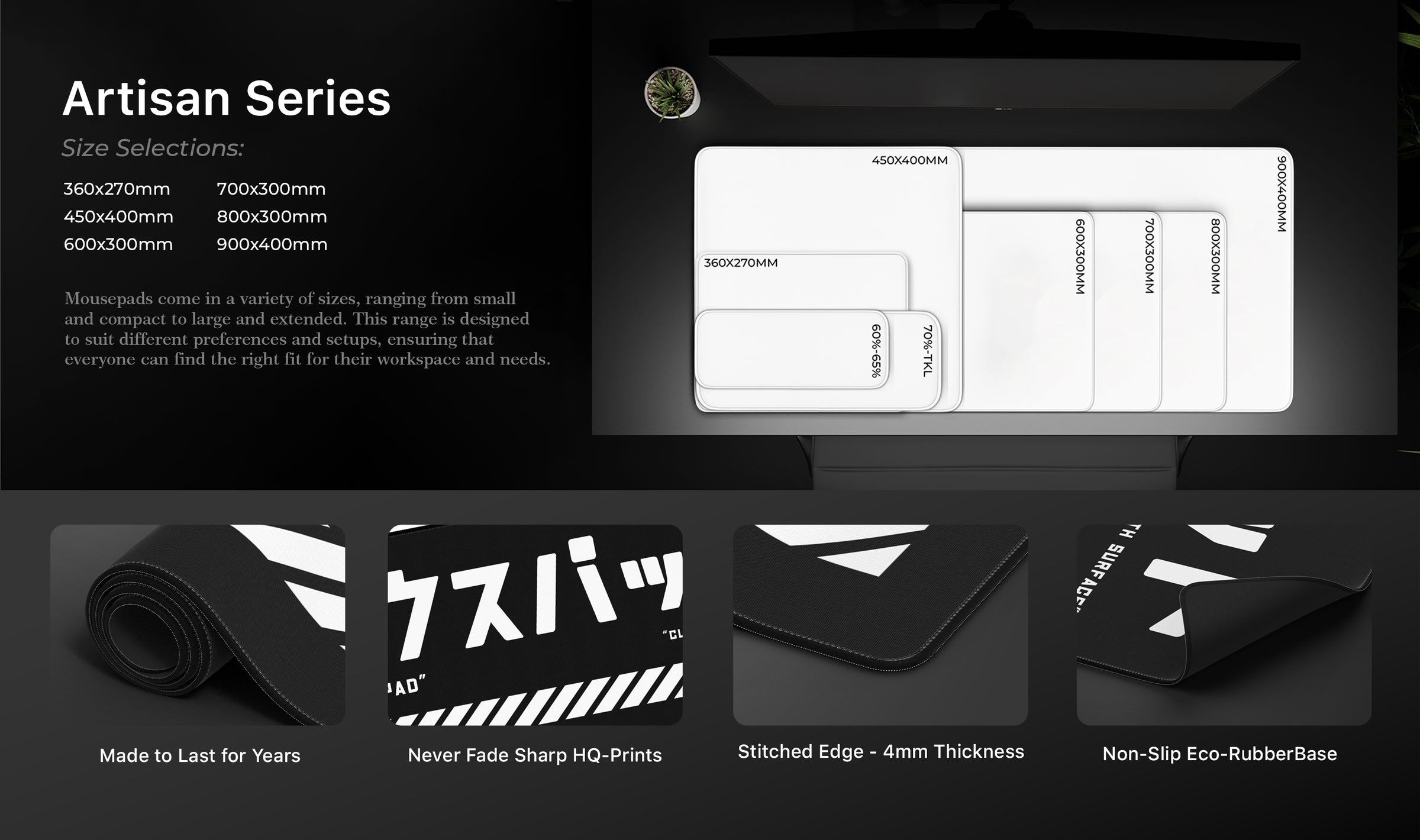 • Our deskmats come in different sizes. 900×400, 800×300, 700×300, 600×300, 450x400, 360x270mm sizes