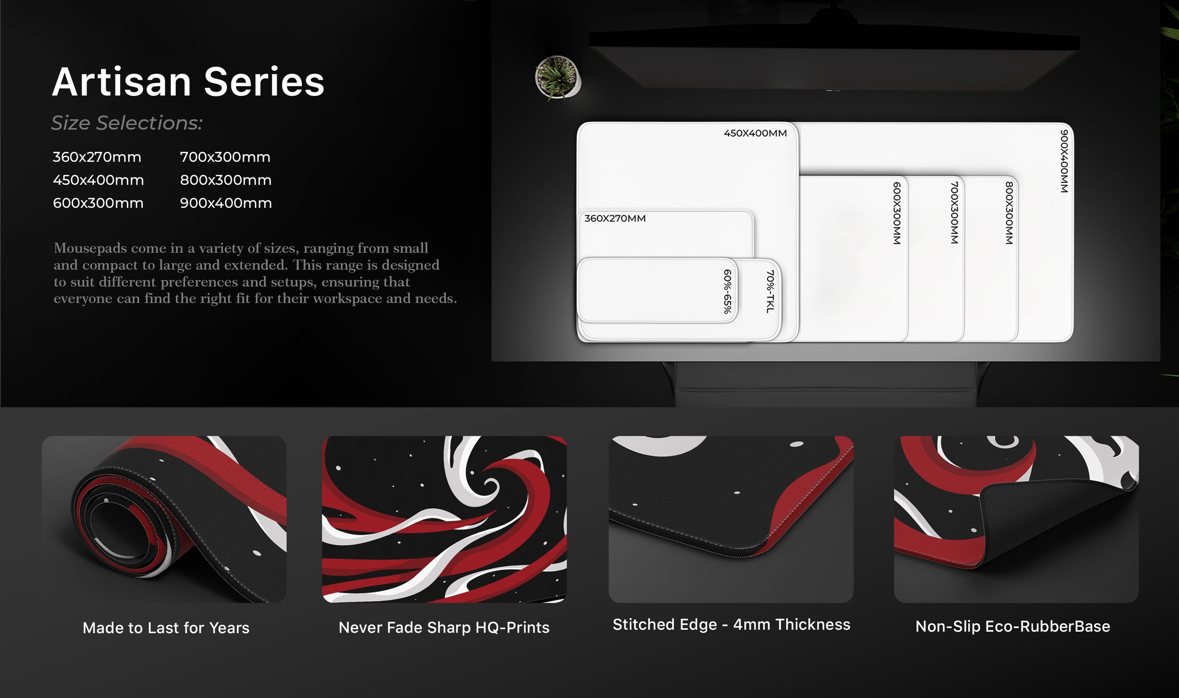 • Our deskmats come in different sizes. 900×400, 800×300, 700×300, 600×300, 450x400, 360x270mm sizes